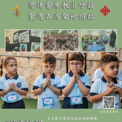 2026年聖週五為聖地募款 各位親愛的弟兄姊妹,願主賜給您們和平! 一年一度的聖週即將再度到來!數百年來,歷任教宗都大力請求,並呼籲普世基督徒在耶穌受難日為聖地捐款,今年教宗的呼籲更是懇切。原因顯而易見: 近年來,聖地烽火連天,雖然已達成某種程度的停火協議,但戰事並未真實結束。最近美國與以色列對伊朗的戰爭更動搖了聖地的穩定,再次提升了恐懼與不確定。基督徒面臨的困境更行惡化,更需要各地教會伸出援手,捐助更多資源,包括基本的糧食、藥品和學費,以確保子女可以接受信仰培育,確保基督徒能繼續在教會起源的聖地生活、工作與祈禱。這點非常重要。 一百年前,基督徒還佔聖地總人口的23%,目前卻僅剩下2%,由於戰爭持續不斷,許多基督徒仍陸續離開。聖地不應像博物館一樣,遊客眾多,卻沒有生活於當地的基督徒。要確保教會誕生地生活的信仰,必須仰賴普世教會的幫助。 懇請大家和過去一樣,熱誠地響應教宗的呼籲,在耶穌受難日為聖地慷慨捐獻。透過這實際的愛德行動,我們與全球天主教徒一同站在聖地,與教會團結一致,直接改變該地區在戰爭、暴力與動盪中人們的生活。我們將如同聖方濟的呼籲,成為這動盪土地上的和平工具。 在聖地生活的所有方濟會士將竭盡心力,將您們的善意、關懷、無私的愛傳遞給聖地所有需要的人。並為大家獻上我們衷心的祝禱: 祈求為我們死而復活的耶穌基督賞賜大家復活的喜樂與平安! 方濟會聖地在華辦事處 林思川神父 敬上
