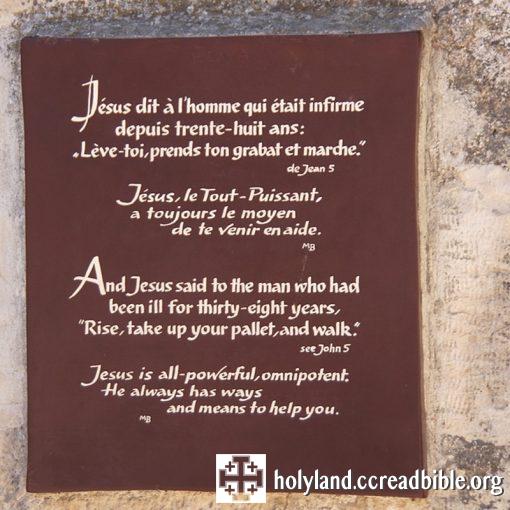 這些事後,正是猶太人的慶節,耶穌便上了耶路撒冷。在耶路撒冷靠近羊門有一個水池,希伯來語叫作貝特匝達,周圍有五個走廊。在這些走廊內,躺著許多患病,瞎眼的,瘸腿的,痳痺的 …… 在那裏有一個人,患病已三十八年。耶穌看見這人躺在那裏,知道他已病了多時,就向他說:「你願意痊癒嗎?」那人回答說:「主,我沒有人在水動的時候,把我放到水池中;我正到的時候,別人在我以前已經下去了。」耶穌向他說:「起來,拿起你的床,行走罷!」那人便立刻痊癒了,拿起自己的床,行走起來。(若五1-9)