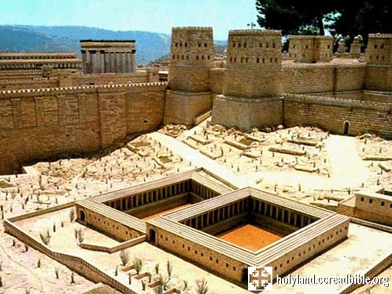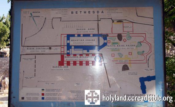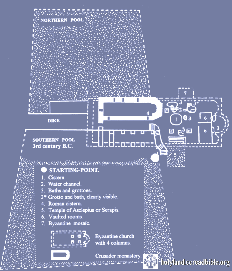 最大的水池變成了蓄水池(1) 而小的水道 (2) 則將水引入大浴場 (3) 在大浴場內,一大群有病的人(被聖殿阻絕的人)正等待著被治癒。這裡就是若望福音第五章所提到的「靠近羊門的地方」,福音記載耶穌在此遇見了一個癱子並治癒了他。(數字對照請見下圖)