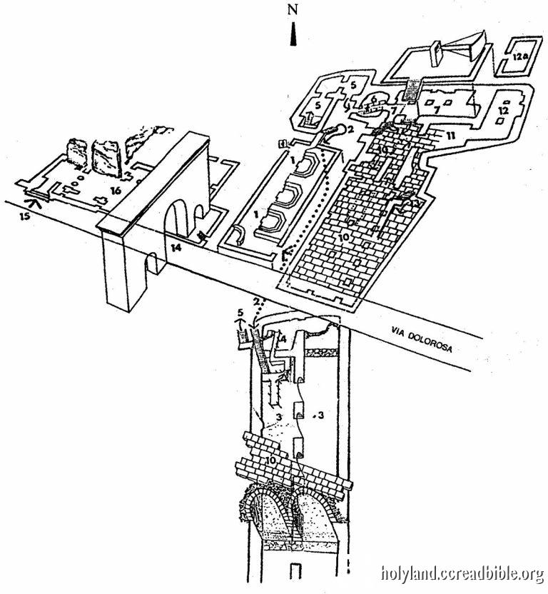 AD70年,耶路撒冷毀於羅馬將軍皇帝(Titus)。AD135年,羅馬皇帝哈德良(Hadrian)為了消滅基督信仰,而將耶路撒冷改建為一個供奉羅馬神明的新城市,並命名為Aelia Capitolina。這裡所看見的羅馬鋪道就是當年哈德連皇帝鋪於蓄水池之頂蓋上的石頭路面,作為當時新城市的廣場和市集。當時鋪在路面的巨石就是取自AD70年被摧毀的「安多尼亞堡」庭院的石頭。