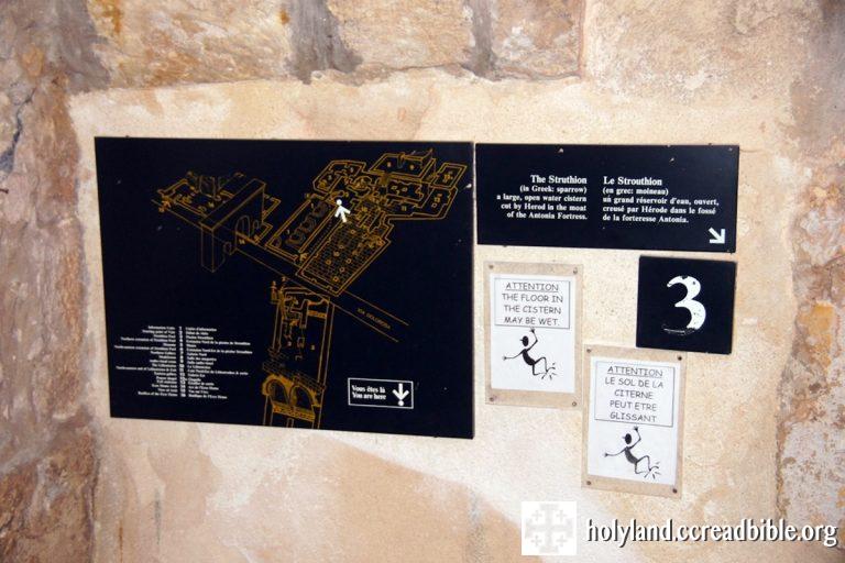 主前二世紀Hasmonean時代挖掘了一條引水道 (6),供應水到聖殿山的貯水池。當大黑落德王在「安多尼亞堡」四周興建護城河(moat)時,摧毀了部份的舊有渠道,同時在護城河內挖鑿了一個水庫(the Struthion Pool),供應「安多尼亞堡」及其四周的用水。第二世紀時羅馬皇帝Hadrian將這個原本是露天蓄水池加上頂蓋,而變成一個封閉的蓄水池(Cistern)。而熙雍修女的Ecce Homo修院的一大部份就是建在貯水池的遺址上。
