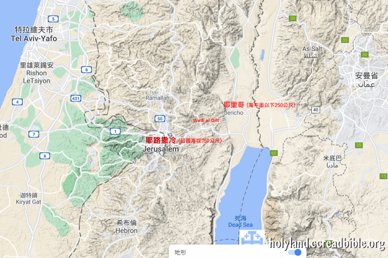 由耶里哥上到耶路撒冷的路,中間落差超過1000公尺,耶里哥位於海平面以下250公尺,而耶路撒冷則超過海拔750公尺。耶穌和門徒們當年所走的路當然是古羅馬道路,這條路經過「黑落德的耶里哥」,同時採用了Wedi al-Qelt的路徑。現今汽車通行的道路完全是重新修築的,一直往南延伸進入到山區中。